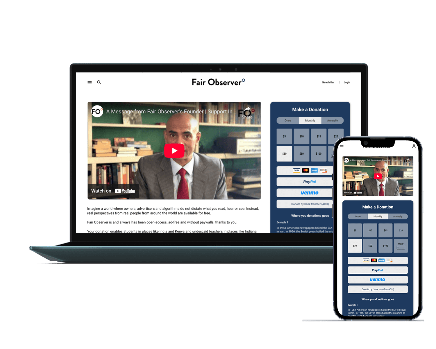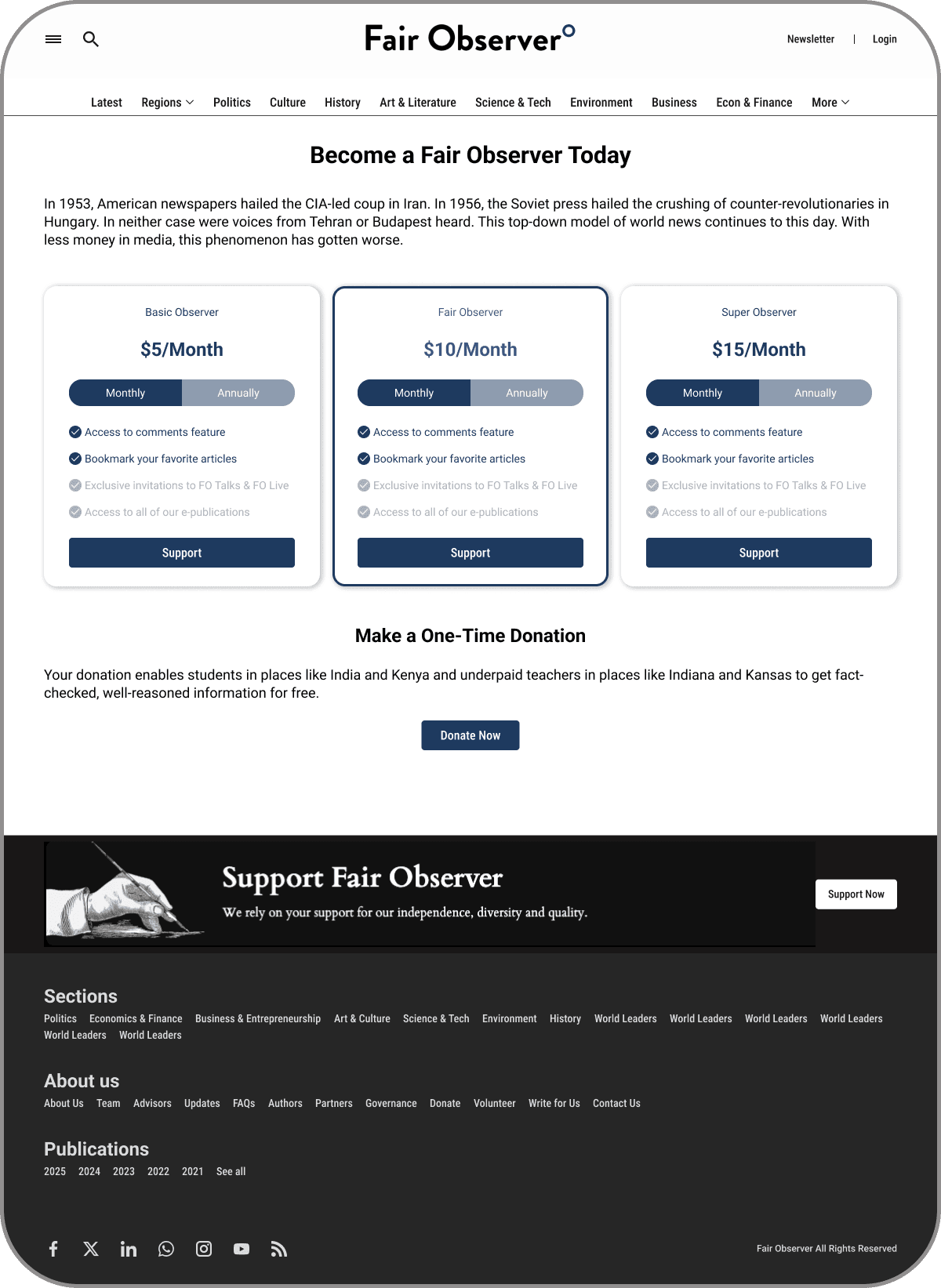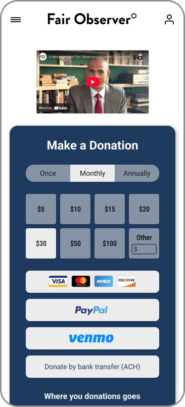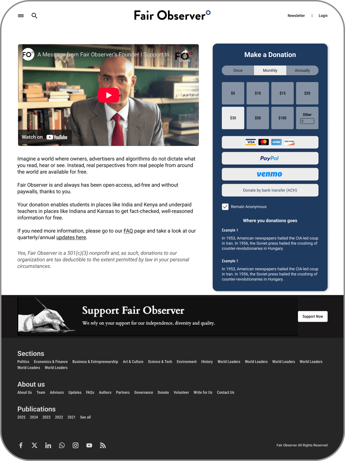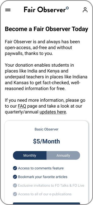 Fair Observer is a nonprofit media organization that relies on reader donations to remain ad-free and unbiased. I'm currently designing donation and subscription flows to increase contribution conversion while maintaining trust and transparency with our mission-driven audience.