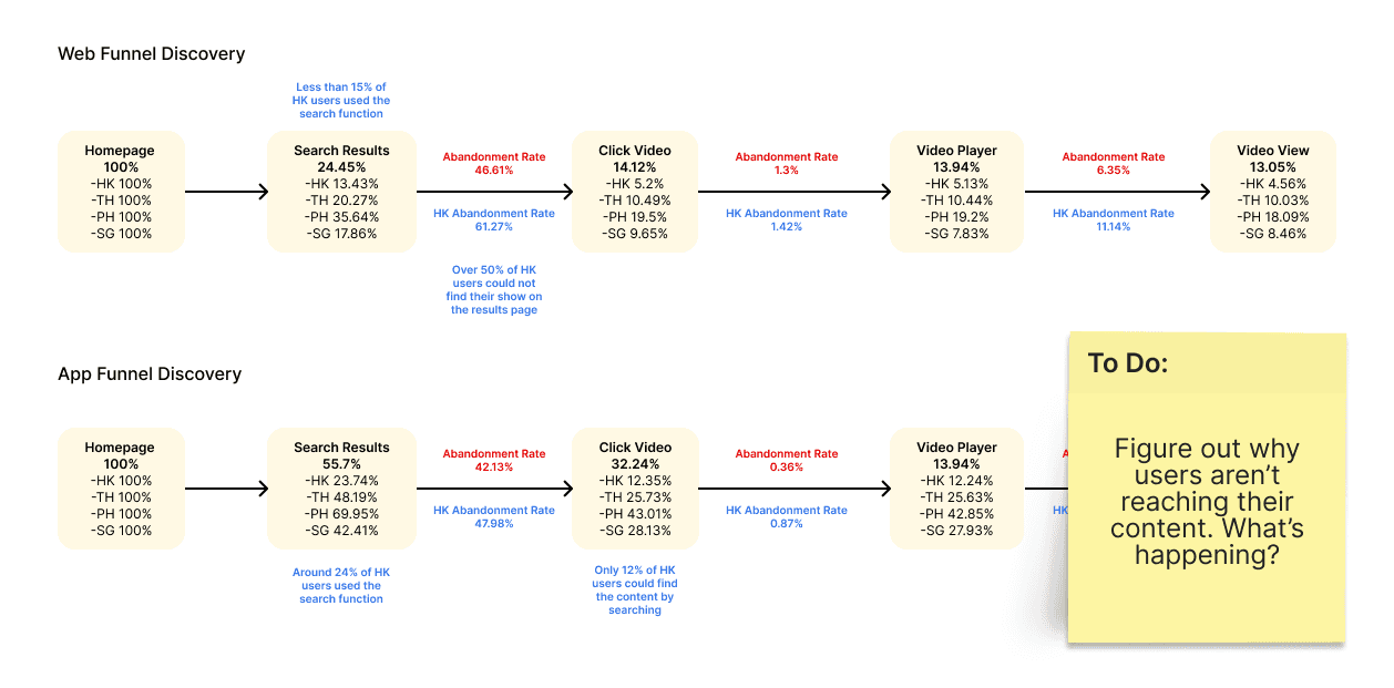 Synthesized user pain points and emotional responses. Defined two key areas of opportunity: better search handling and smoother discovery from dead ends.